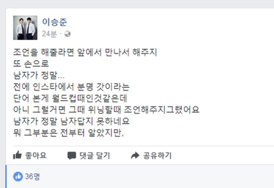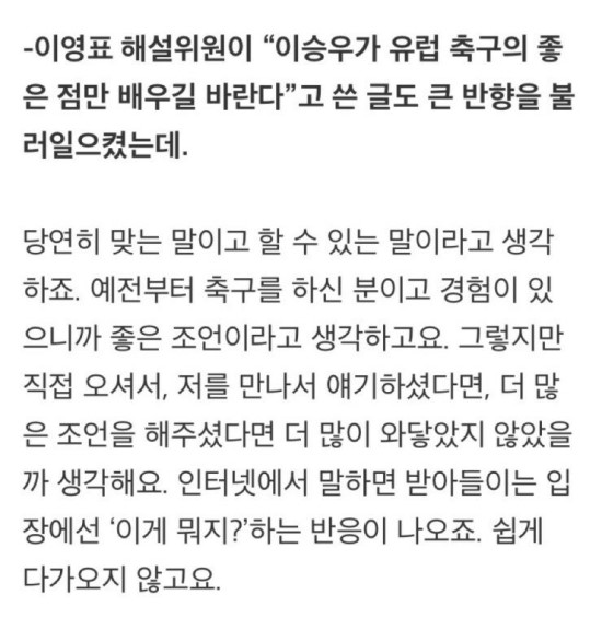 한국 축구 레전드 이영표가 페이스북으로 조언글을 남겼으나 "직접 와서 말하라" 시전