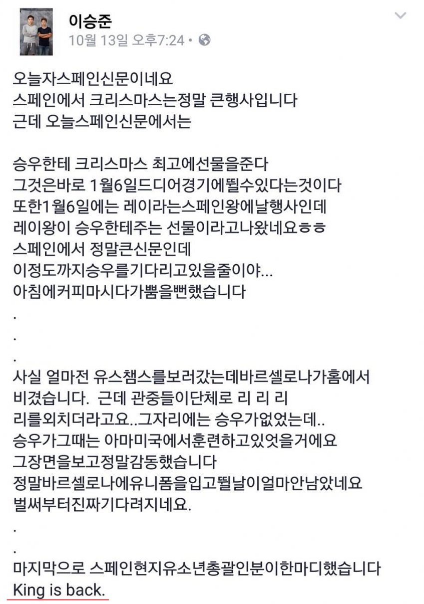 부진이 길어지자 네티즌들은 이승우 형의 글 'King is back' 에서 영감을 얻어 킹이즈불백, 바르셀로나 불백 등으로 이승우를 부르기 시작합니다.