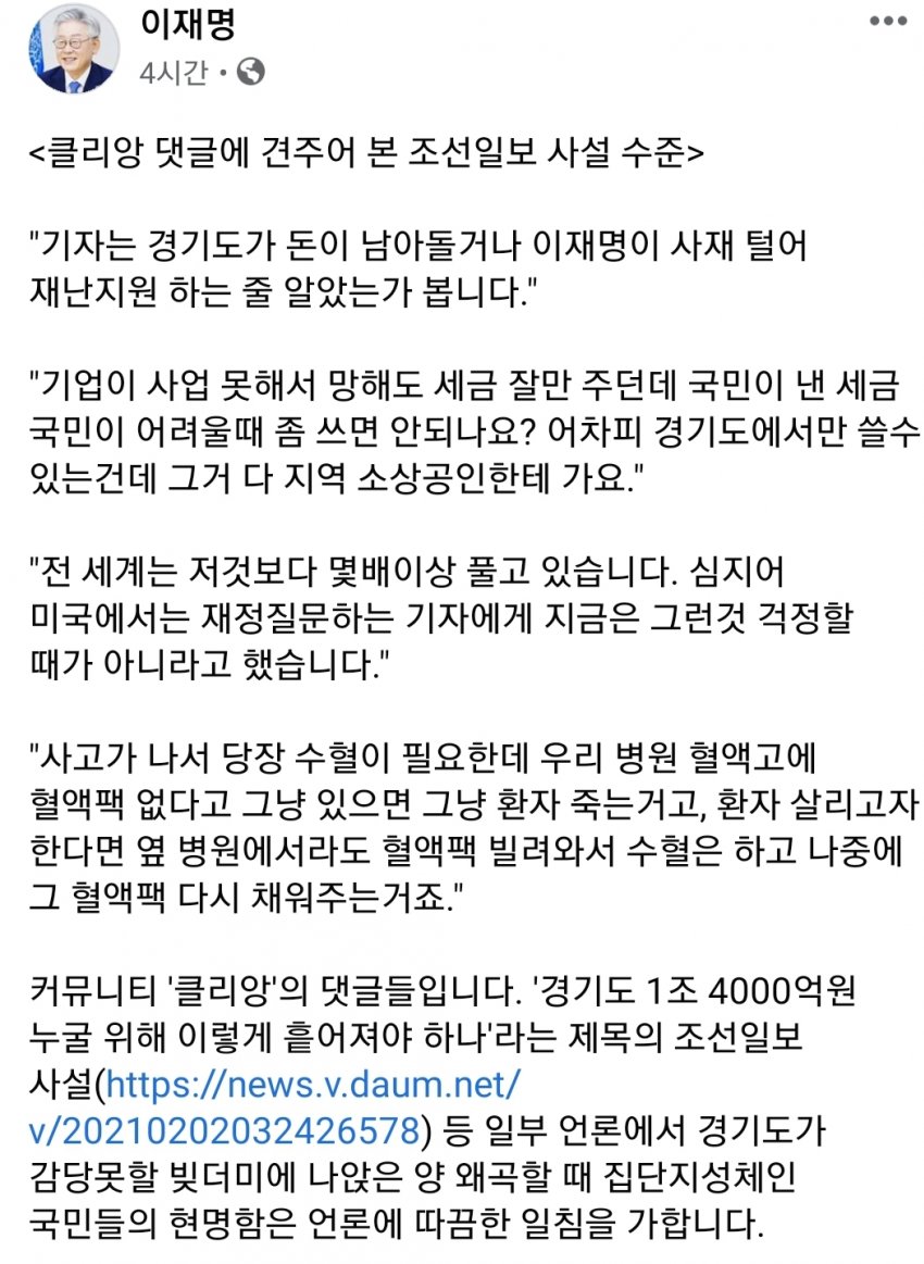 이재명 지사가 재난지원금 지급에 대한 비판적인 사설들에 대한 반박글을 자신에 페이스북에 올렸습니다.