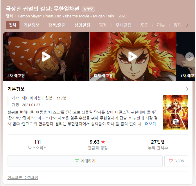 4일 영화진흥위원회 영화관 입장권 통합전산망에 따르면 일본 애니메이션 '극장판 귀멸의 칼날: 무한열차 편'(감독 소토자키 하루오)은 지난 3일 879개 스크린에서 2662회 상영하며 관객 5만 1973명을 동원하며 박스오피스 1위에 올랐습니다. 누적 관객 수는 27만 9393명입니다.