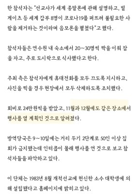 한 참석자는 "선교사가 세계 종말론에 관해 설명하고, 빌 게이츠 등 세계 갑부 8명이 코로나19를 퍼뜨려 불필요한 사람을 제거하는 것이라며 음모론을 펼쳤다"고 했습니다.