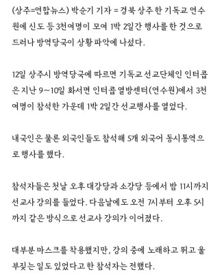 (상주=) 박순기 = 경북 상주 한 기독교 연수원에 신도 등 3천여명이 모여 1박 2일간 행사를 한 것으로 드러나 방역당국이 상황 파악에 나섰습니다.