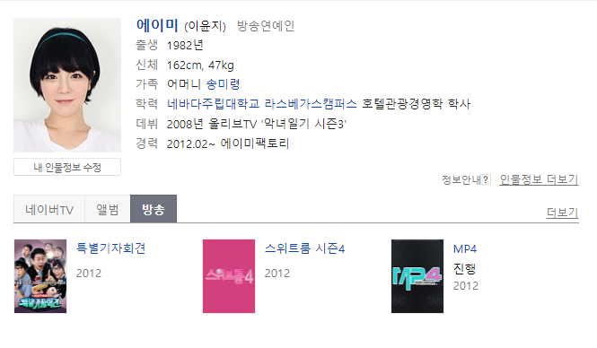 에이미는 CJ E&M의 채널인 Olive의 악녀일기 시즌3(2008)로 방송에 데뷔했습니다.