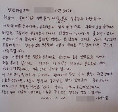 사장은 “뒤늦게 불미스러운 이번 일에 대해 얘기 듣고 당혹감과 황망함에 어찌할 바를 모르다가, 부끄러움과 염치 불구하고 사과의 글을 올린다”고 운을 뗐고