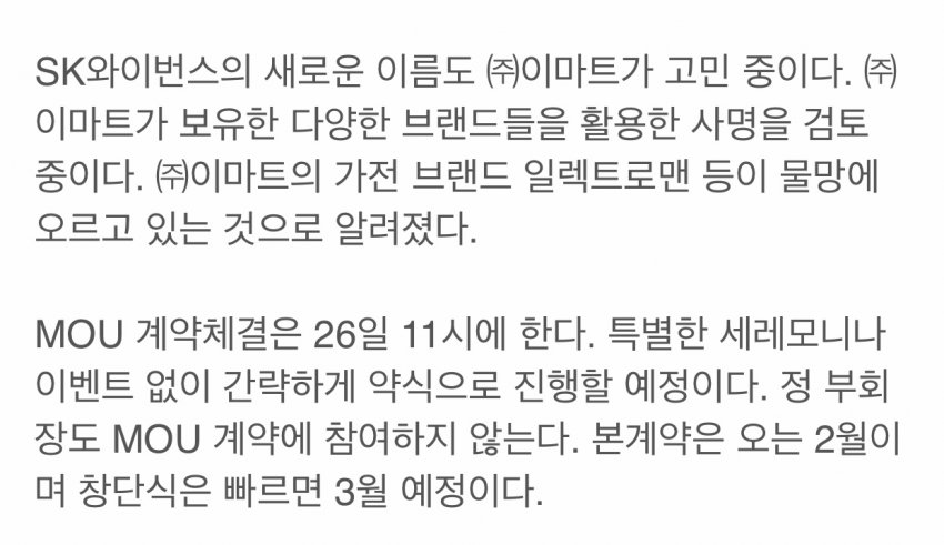 이날 신세계그룹과 SK텔레콤은 SK와이번스 야구단을 신세계그룹이 인수하는 데 합의하고 양해각서(MOU)를 체결했다고 밝혔습니다.