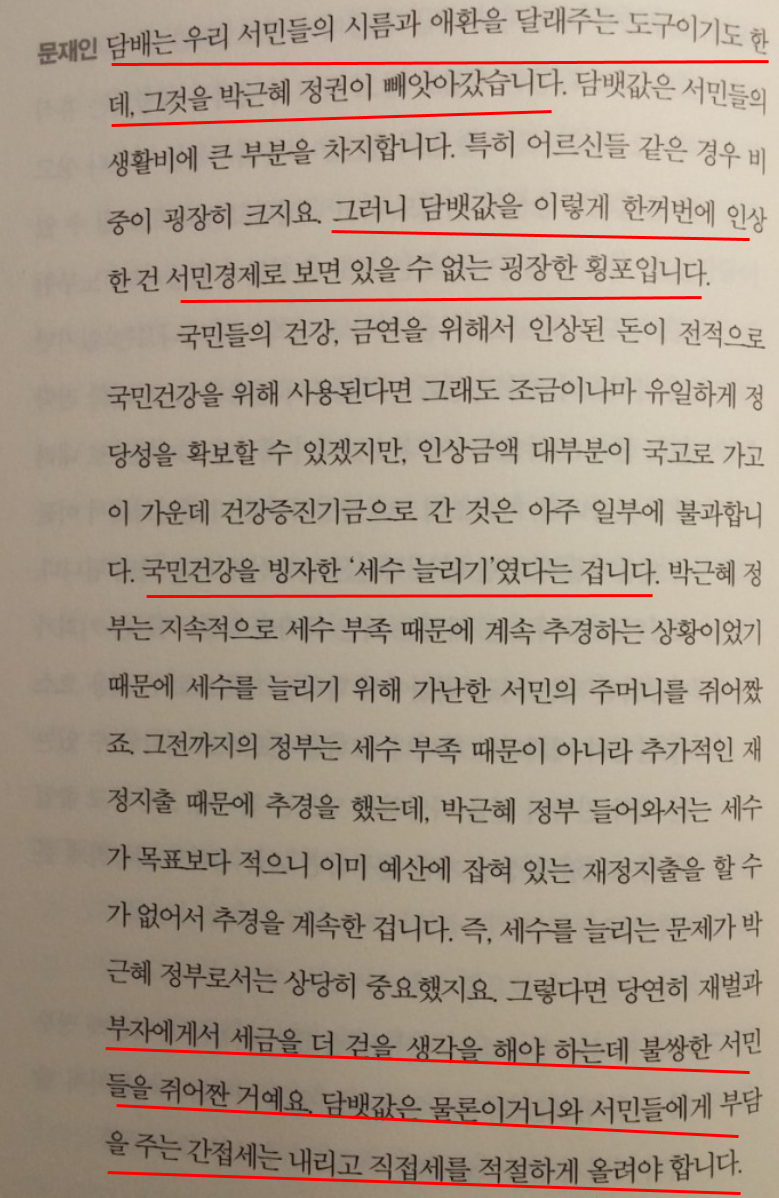 문 대통령은 또한 자서전에서 “담뱃값은 서민들의 생활비에 큰 부분을 차지한다”며 “담뱃값을 이렇게 한꺼번에 인상한 건 서민경제로 보면 있을 수 없는 굉장한 횡포”라고 지적했습니다.